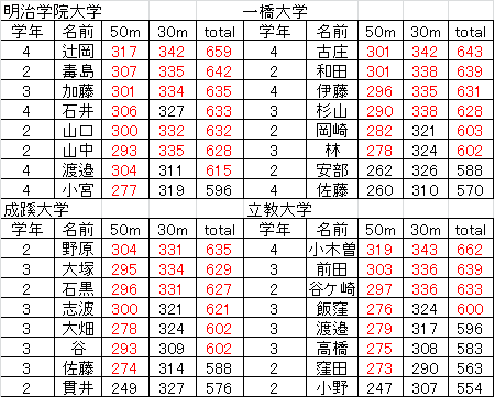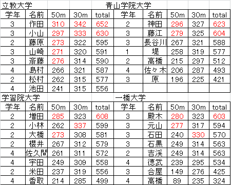 ****************************** 本日の天候は晴れで、風もほとんどありませんでした。試合中は気温も暖かく、絶好のアーチェリー日和と言えました。本日の試合はリーグ第四、五戦での勝利を目標として、相手校を意識しすぎず自分達が出せる最大限の点数を出すことを考えました。点数目標として、来週からの点数向上の礎として3700点を超えて出すことを目指しました。 まず50mでは、序盤に点数に伸び悩み、相手校に差をつけられてしまいました。しかし中盤から高橋、窪田が高得点を出し、チームの勢いを盛り上げます。そこから全員が練習通りの射をすることができ、序盤のマイナスを挽回していきました。 続く30mでは、50mで盛り返した勢いをそのままに入ることができました。前田が高得点を連発し、エースとしての活躍を見せました。また、小野が50mの挽回するように赤字を出し、勢いを上げていきました。全体的に、選手は30mは終始良い射をすることに集中できていました。 結果として、青山学院に勝利することができましたが、満足のいく点数を達成することはできませんでした。その原因として、新歓活動などによる練習量の低下での体力不足及び当て勘が損なわれたことが挙げられます。