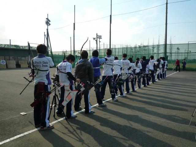 ************************ 本日は2月とは思えないほがらかな天候で、絶好なコンディションでの試合となりました。部内のみで行う試合ということもあり、試合形式を特殊なものにして行いました。今回の形式は、各チームの3の倍数の順位となった5名の選手の合計点で競うというものです。 今年初めての試合ということもあり、一カ月間のフリー練習期間での成果を示す場でもあり、また一カ月間試合のなかったことのブランクを取り戻すことを意識しました。 50m序盤は1年の金田が53点という高得点をたたき出し、雰囲気を盛り上げました。また2年の窪田、小野もそれに続き、コールを重ねました。3年生も上級生の意地を見せ、終始高得点を出し続け勢いを付けました。 30mでは1年宮田が1エンド目に58点という高得点を出し、周囲を驚かせました。また3年の作田も59点を出し、周囲をさらに活気づけました。4年の小木曽も30金を射つなど、最上級生の意地を見せました。 2年の横田、松村拓は両距離において終始安定して高得点を出し自己新を出しました。 本日の試合は下級生、特に2年男子の活躍が見られ、次戦の日本大学戦、また来週に行われる東京大学戦につながる試合になったと感じました。 今回の試合を通して、強化練を週5に増やし、部員一同が毎日目標を持って練習に臨んだこともあって、競技に対する意識の向上が見られ、これから始まる連戦や合宿、またリーグ戦においても、必ず良い成果を上げることができると思います。 長文になってしまいましたが、本日の試合報告は52期が行わせていただきました。今後とも洋弓部を宜しくお願い致します。 52期主将 窪田亮史 52期女子リーダー 石野佑果 |